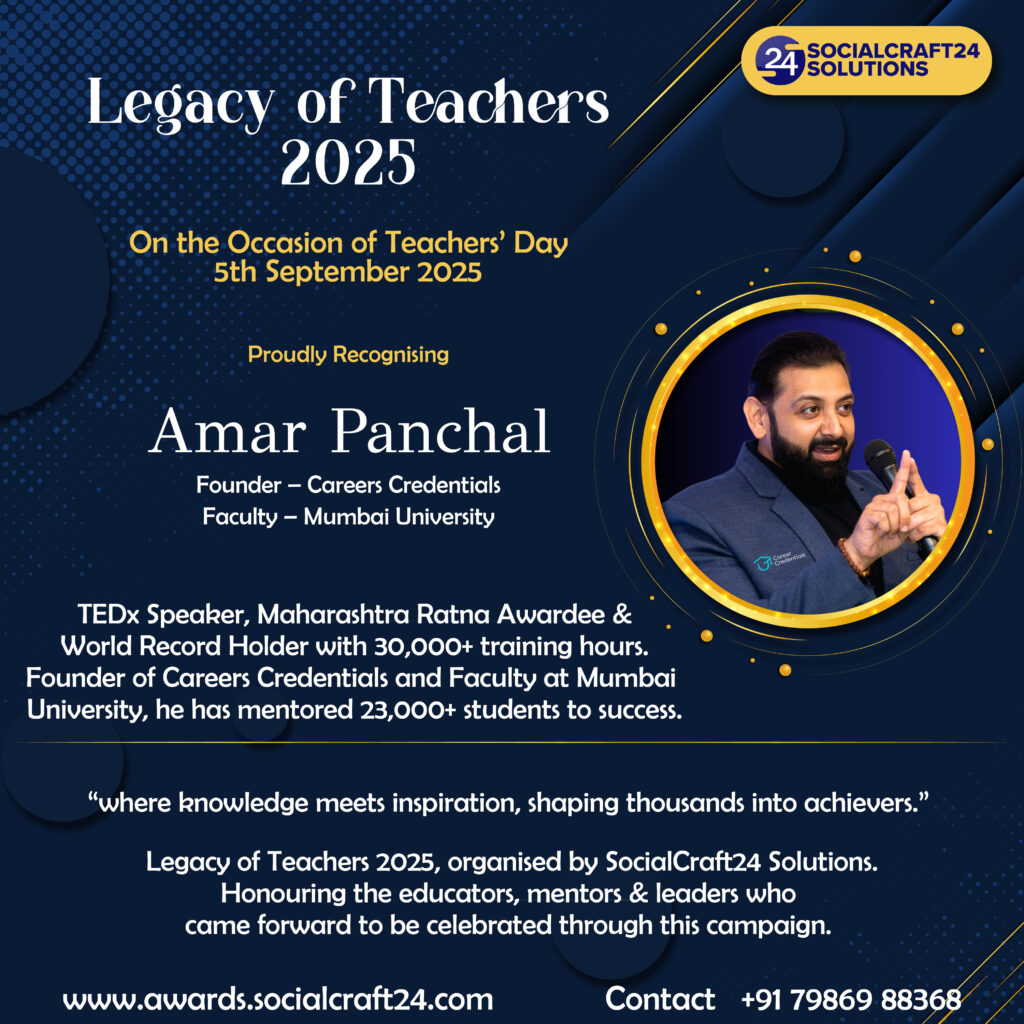 On this Teachers’ Day 2025, as part of the Legacy of Teachers initiative by SocialCraft24 Solutions, Dr. Amar Panchal is honoured for his unparalleled contributions to education. His journey is a shining example of how passion, perseverance, and purpose can create a lasting legacy in the world of learning.