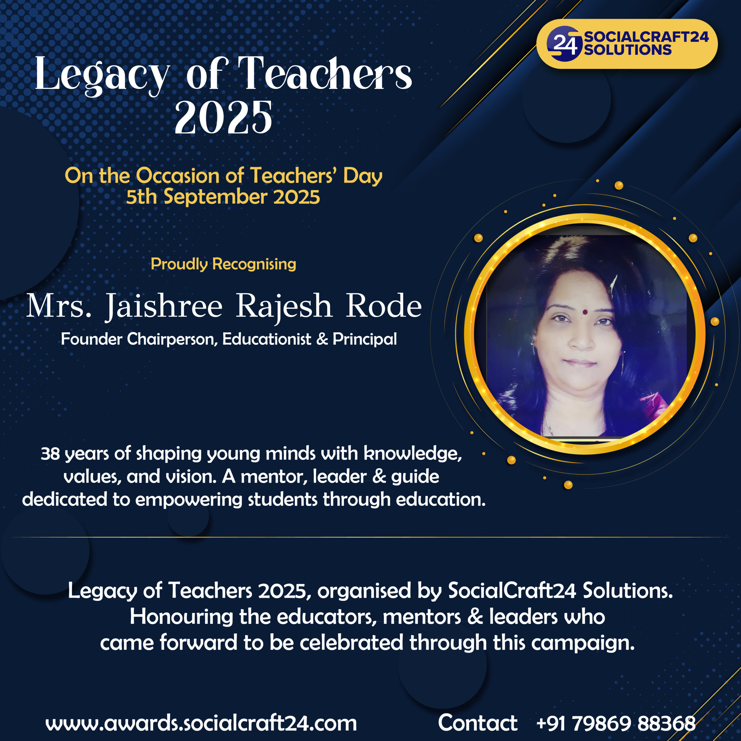 Mrs. Jaishree Rajesh Rode’s legacy is one of inspiration—of a woman who wears many hats with grace, intellect, and compassion. As an educationist, leader, and social reformer, she continues to light the path for generations to come.