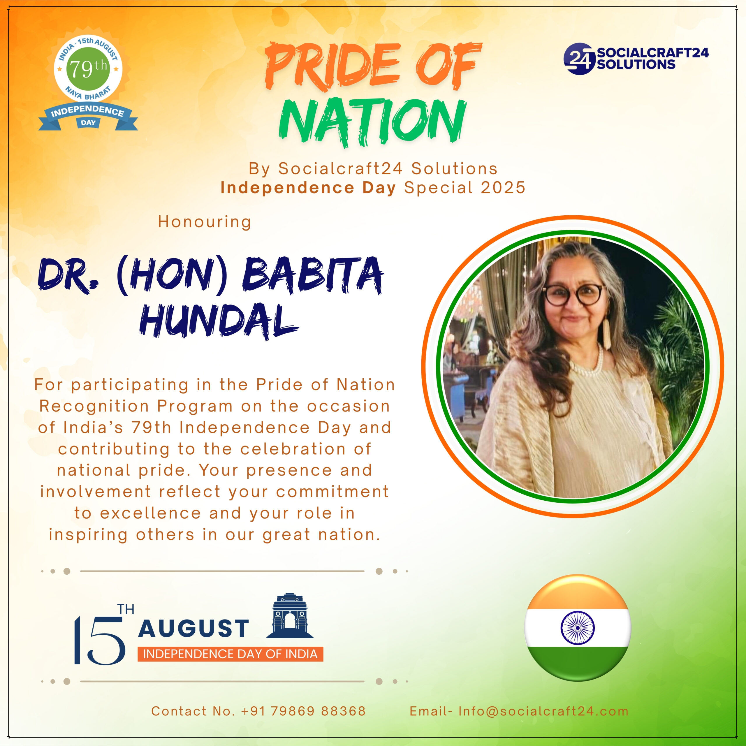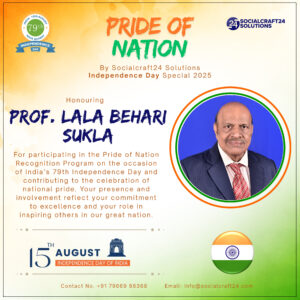 This Independence Day, SocialCraft24 Solution proudly presents the Pride of Nation – Independence Day Special 2025, a tribute to individuals whose dedication, achievements, and spirit reflect the very essence of India’s pride. From diverse fields and walks of life, these remarkable personalities have not only excelled in their respective domains but have also inspired countless others through their journey. As our nation celebrates 78 years of freedom, we honour these torchbearers of progress, unity, and excellence — the true embodiments of a stronger, brighter India.